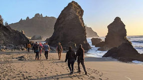 Hike a charming and awe-inspiring trail directly from basecamp that has stunning views of the ocean, sea stacks, and headlands. This trail meanders through a mossy forest, cliff lookouts, and down to the ocean