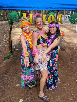 Hawaiian themed party at basecamp with music, dancing, and hula dancing